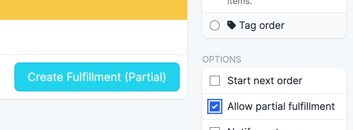 When scanning items, to partially ship an order, click the drop-down menu to the right of the “Fulfill Items” button. Select the “Allow partial fulfillment” checkbox to enable partial shipping: