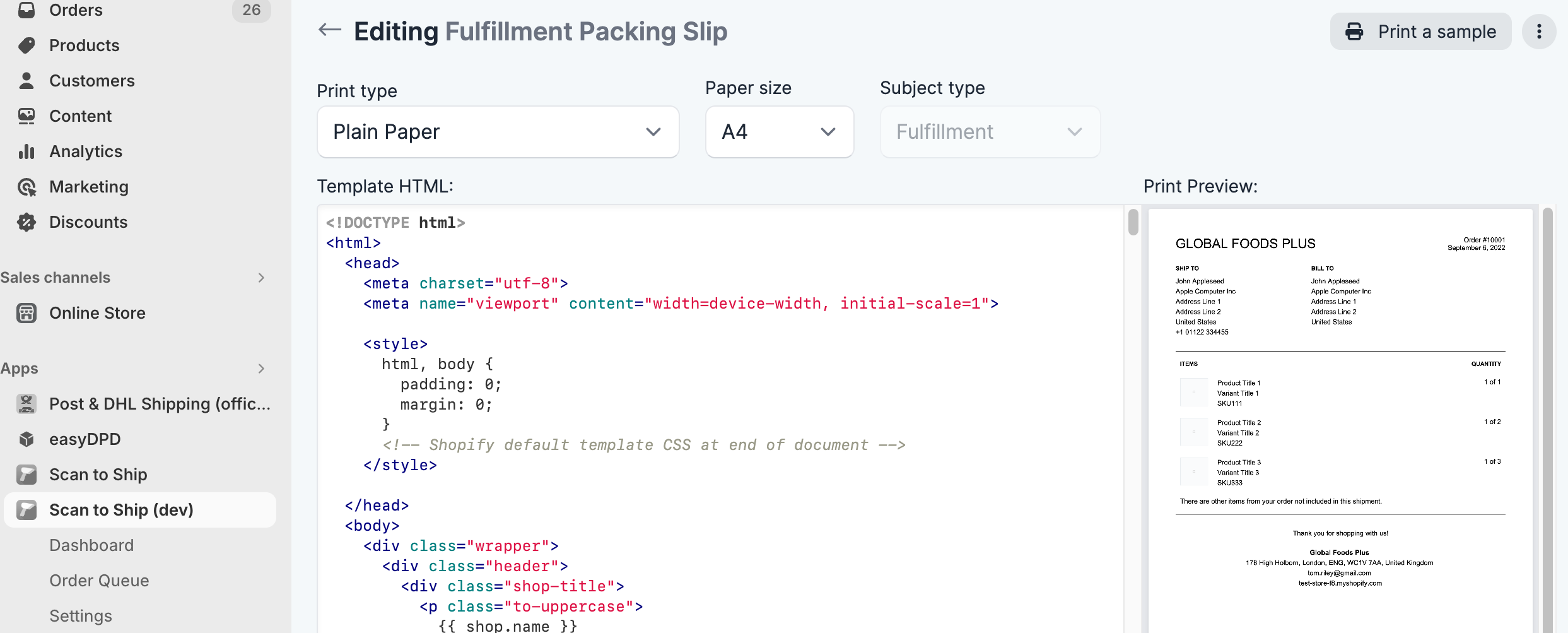 Scanpacker comes with a built-in template for a packing slip that is identical to Shopify’s default packing slip. In fact, Scanpacker’s template system is fully compatible with Shopify’s. Therefore, if you have customised the packing slip template in the Shopify admin, you can simple copy and paste your changes straight into Scanpacker.